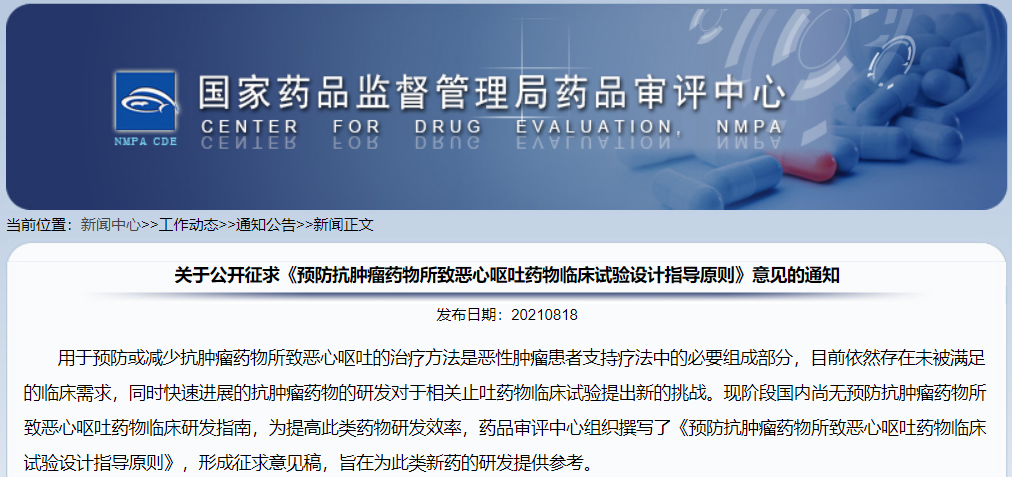 關(guān)于公開征求《預(yù)防抗腫瘤藥物所致惡心嘔吐藥物臨床試驗(yàn)設(shè)計(jì)指導(dǎo)原則》意見的通知