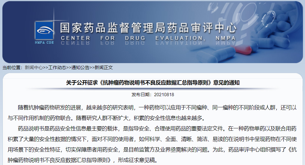 關(guān)于公開征求《抗腫瘤藥物說明書不良反應(yīng)數(shù)據(jù)匯總指導(dǎo)原則》意見的通知