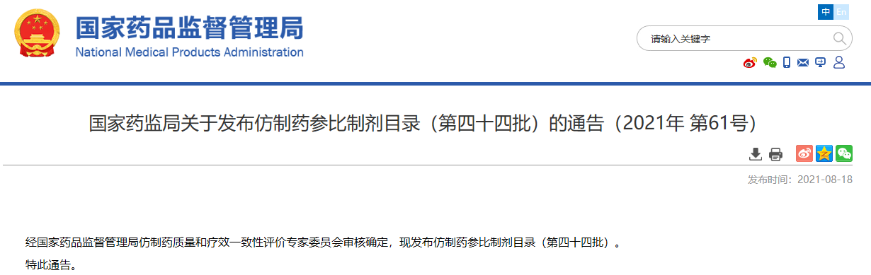 關(guān)于發(fā)布《化學(xué)仿制藥參比制劑目錄(第四十四批)》的公示(征求意見稿)