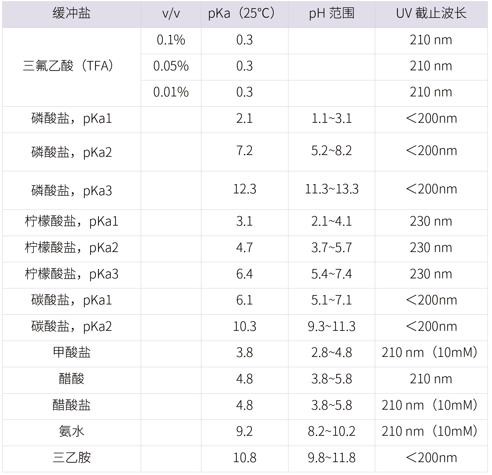 緩沖體系選擇的要求:能適當(dāng)控制離子化、與檢測器兼容性、緩沖鹽溶液與有機(jī)相的互溶性、流動相的pH是否在色譜柱的安全范圍內(nèi)。
