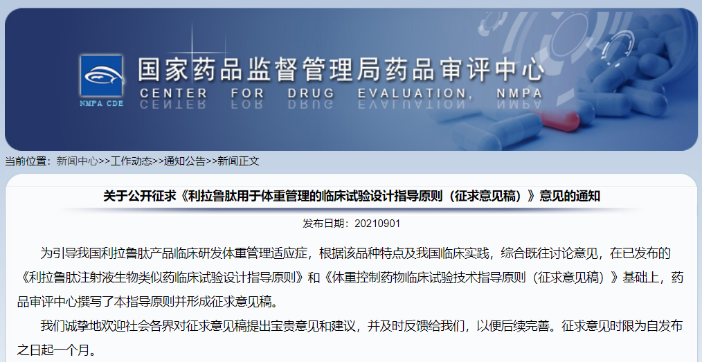 關(guān)于公開征求《利拉魯肽用于體重管理的臨床試驗設(shè)計指導(dǎo)原則(征求意見稿)》意見的通知