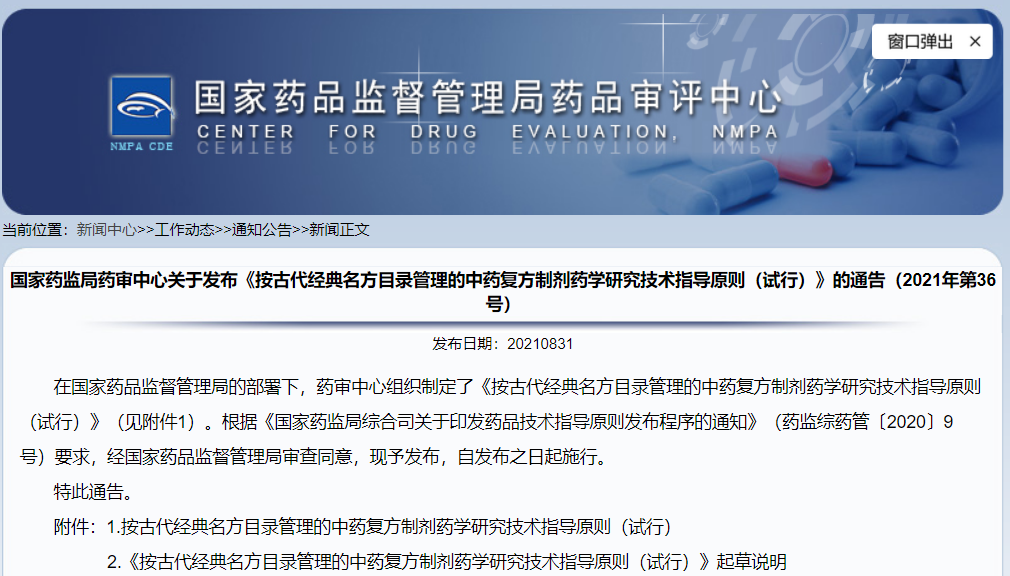 關(guān)于發(fā)布《按古代經(jīng)典名方目錄管理的中藥復(fù)方制劑藥學(xué)研究技術(shù)指導(dǎo)原則(試行)》的通告(2021年第36號)