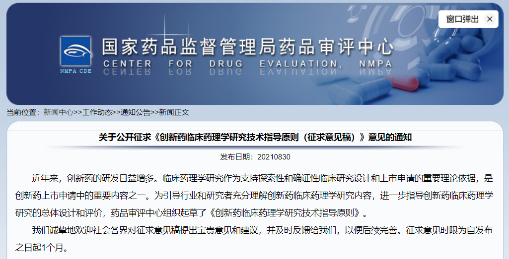 關(guān)于公開征求《創(chuàng)新藥臨床藥理學(xué)研究技術(shù)指導(dǎo)原則(征求意見稿)》意見的通知
