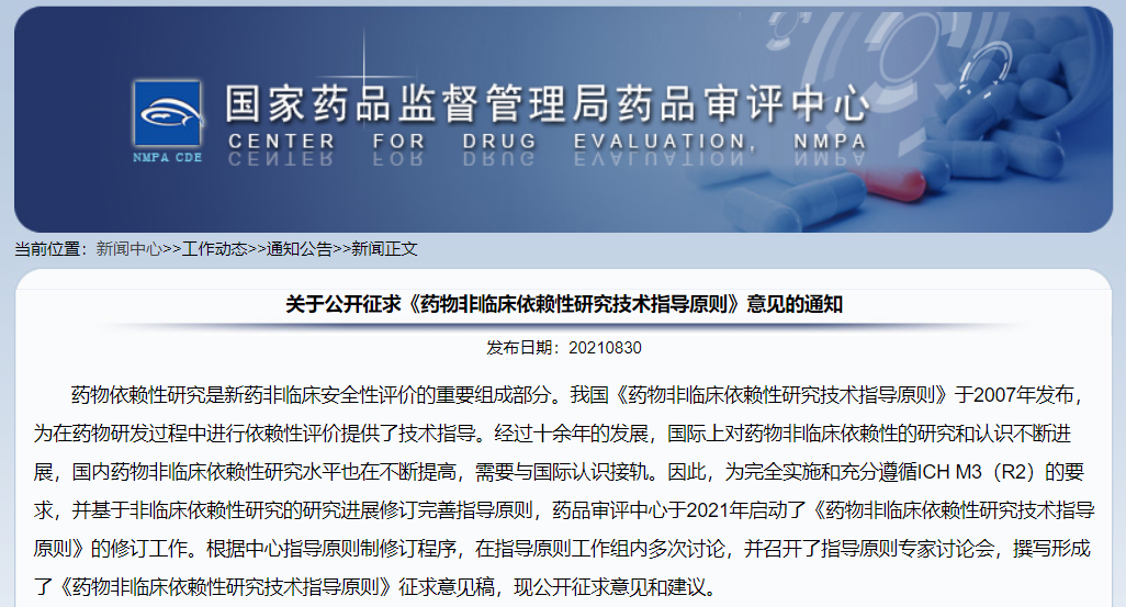 關(guān)于公開征求《藥物非臨床依賴性研究技術(shù)指導(dǎo)原則》意見的通知