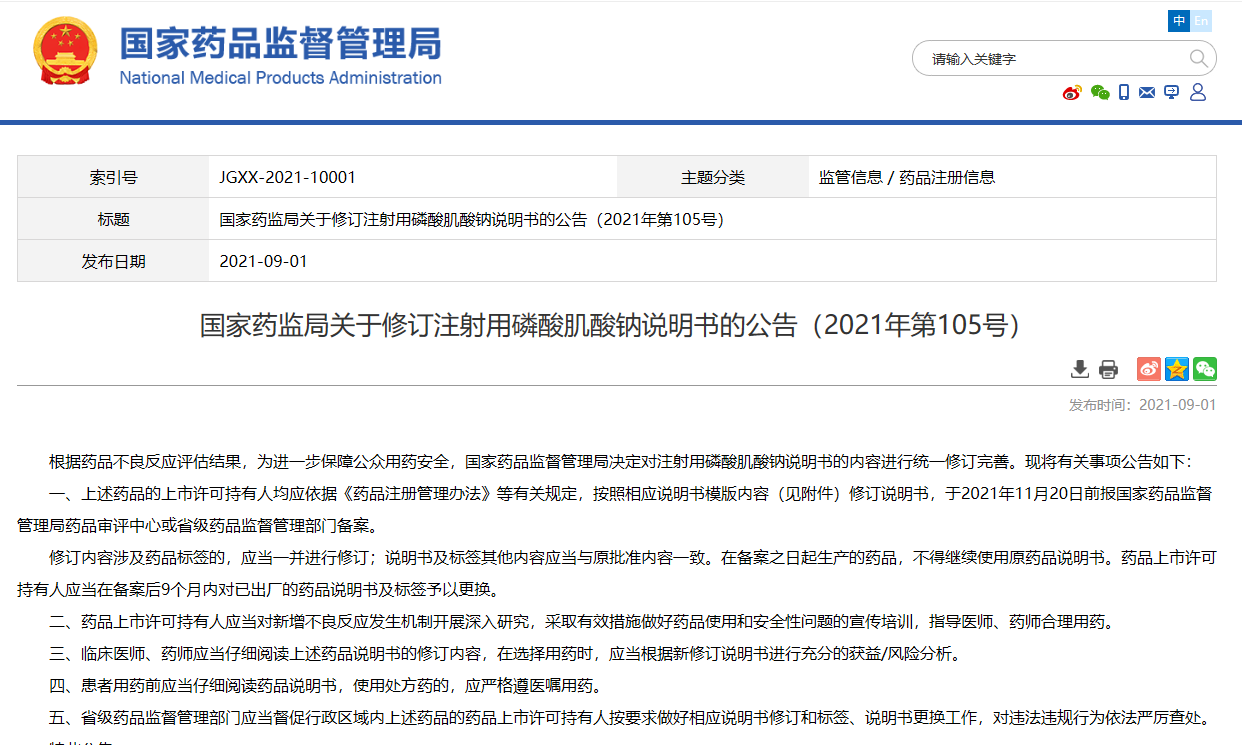 關(guān)于修訂注射用磷酸肌酸鈉說明書的公告(2021年第105號)