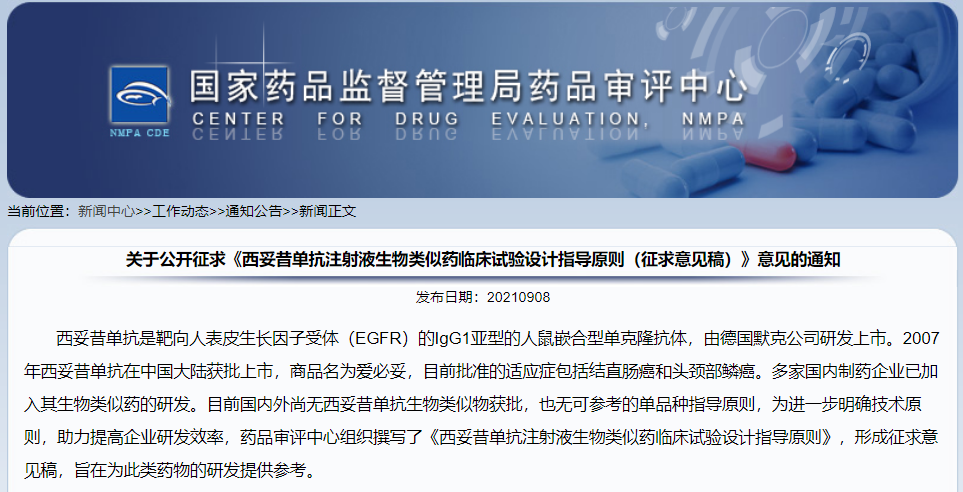 關(guān)于公開征求《西妥昔單抗注射液生物類似藥臨床試驗設計指導原則(征求意見稿)》意見的通知