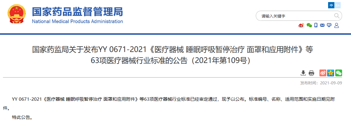國家藥監(jiān)局關(guān)于發(fā)布YY 0671-2021《醫(yī)療器械 睡眠呼吸暫停治療 面罩和應用附件》等63項醫(yī)療器械行業(yè)標準的公告(2021年第109號)