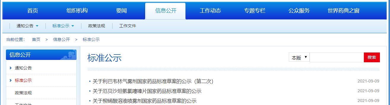 1.本周關(guān)于柳烯酸溶液噴霧劑、厄貝沙坦氫氯噻嗪片、 利巴韋林氣霧劑國家藥品標準公示。