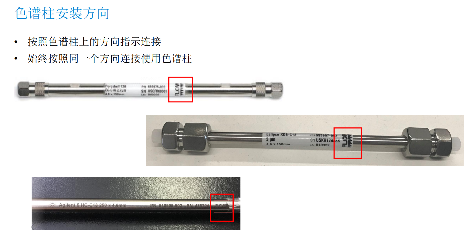 色譜柱安裝應按照同一個方向連接使用,且需要按照色譜柱上的方向指示連接,盡量避免色譜柱反向連接!