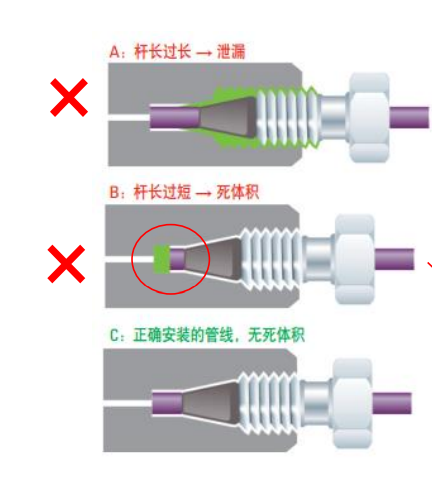 ? 安裝色譜柱時管線伸出接頭長度過長,使得螺紋擰入較淺,會導致密封性不好而漏液,進一步引起基線漂移或響應降低;