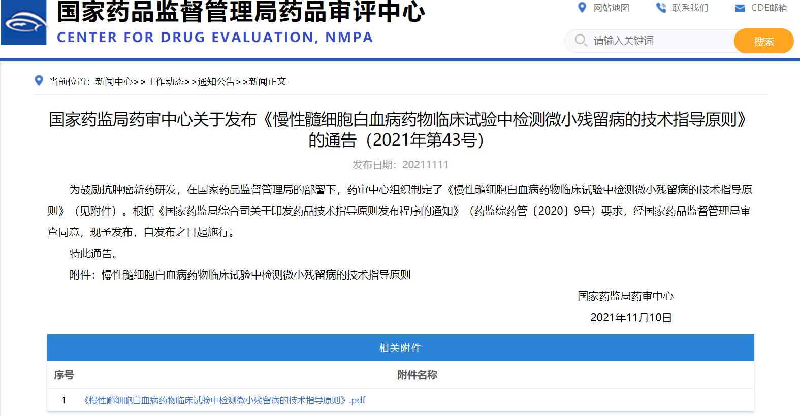 國家藥監(jiān)局藥審中心關(guān)于發(fā)布《慢性髓細胞白血病藥物臨床試驗中檢測微小殘留病的技術(shù)指導(dǎo)原則》的通告
