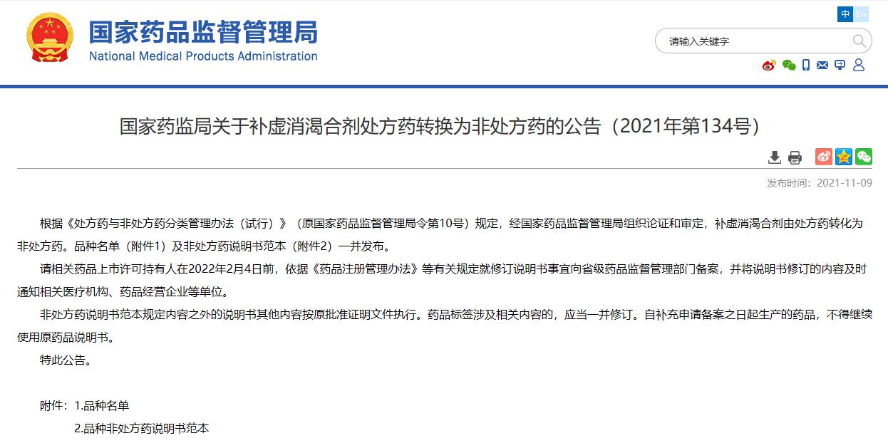 國家藥監(jiān)局關(guān)于補虛消渴合劑處方藥轉(zhuǎn)換為非處方藥的公告(2021年第134號)