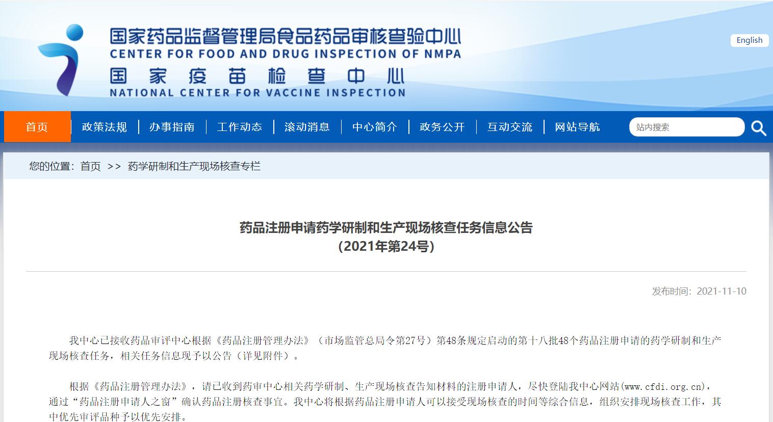藥品注冊申請藥學(xué)研制和生產(chǎn)現(xiàn)場核查任務(wù)信息公告(2021年第24號)