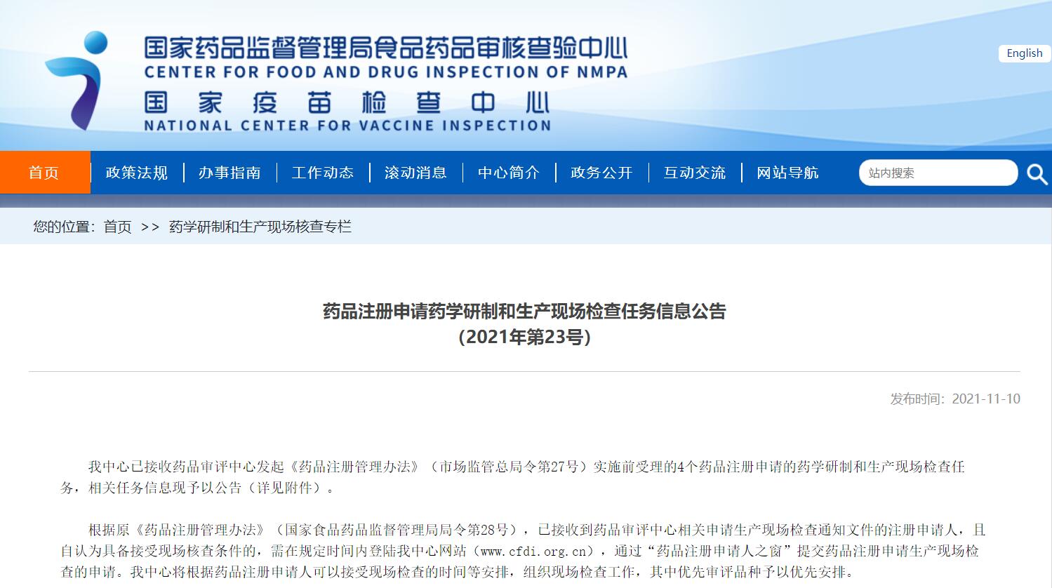 藥品注冊申請藥學(xué)研制和生產(chǎn)現(xiàn)場檢查任務(wù)信息公告(2021年第23號)
