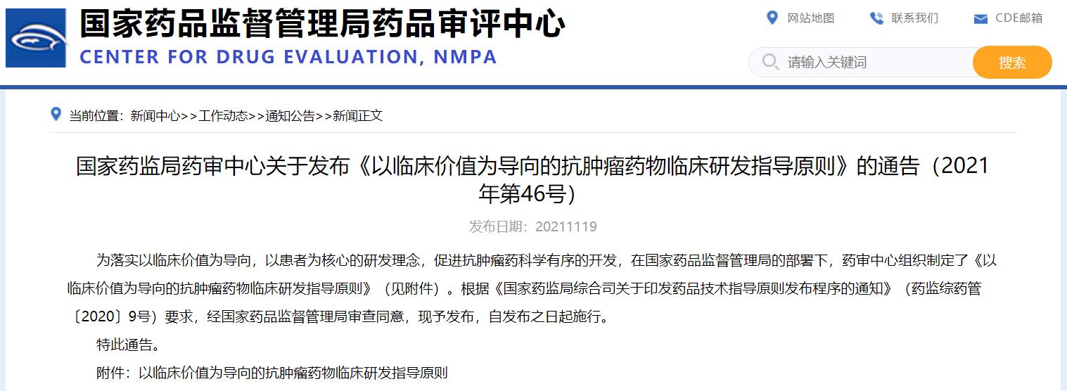 國家藥監(jiān)局藥審中心關(guān)于發(fā)布《以臨床價(jià)值為導(dǎo)向的抗腫瘤藥物臨床研發(fā)指導(dǎo)原則》的通告(2021年第46號(hào))