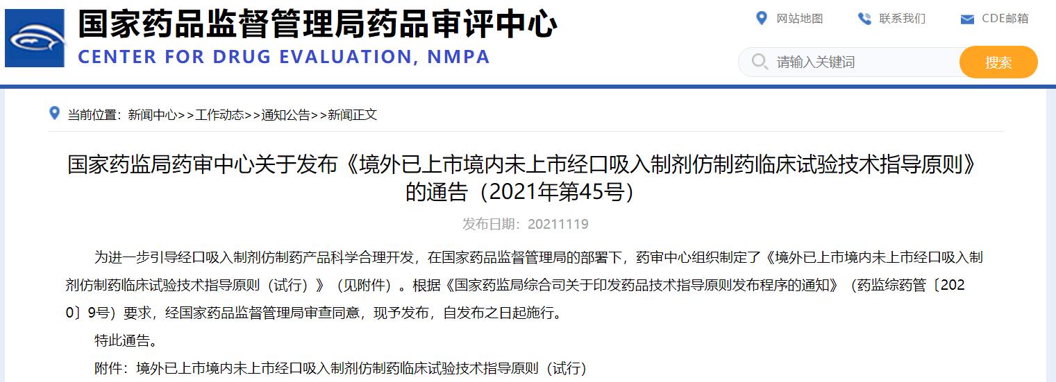 國家藥監(jiān)局藥審中心關(guān)于發(fā)布《境外已上市境內(nèi)未上市經(jīng)口吸入制劑仿制藥臨床試驗(yàn)技術(shù)指導(dǎo)原則》的通告(2021年第45號(hào))