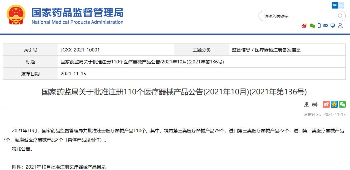 國家藥監(jiān)局關(guān)于批準(zhǔn)注冊(cè)110個(gè)醫(yī)療器械產(chǎn)品公告(2021年10月)(2021年第136號(hào))