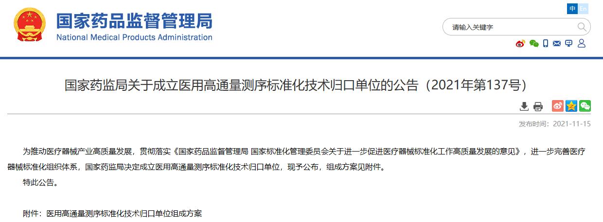 國家藥監(jiān)局關(guān)于成立醫(yī)用高通量測(cè)序標(biāo)準(zhǔn)化技術(shù)歸口單位的公告(2021年第137號(hào))