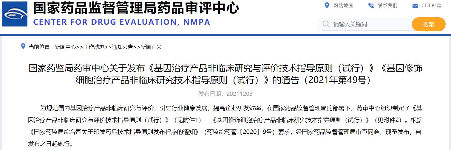 國家藥監(jiān)局藥審中心關于發(fā)布《基因治療產品非臨床研究與評價技術指導原則(試行)》《基因修飾細胞治療產品非臨床研究技術指導原則(試行)》的通告(2021年第49號)