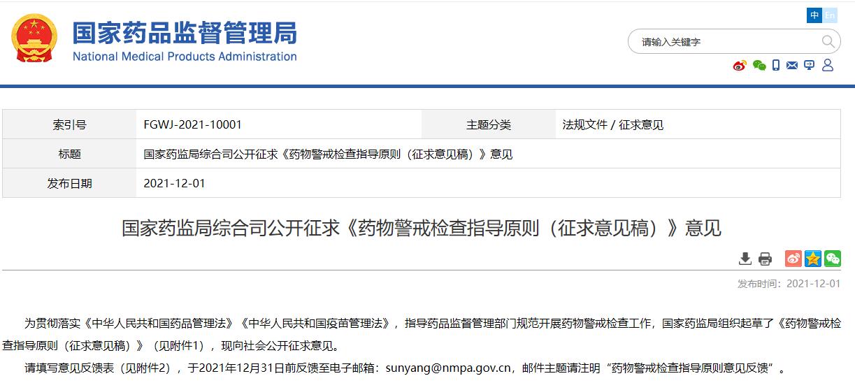 國家藥監(jiān)局綜合司公開征求《藥物警戒檢查指導原則(征求意見稿)》意見
