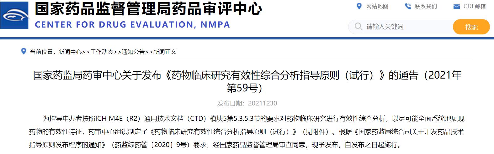 國家藥監(jiān)局藥審中心關于發(fā)布《藥物臨床研究有效性綜合分析指導原則(試行)》的通告(2021年第59號)