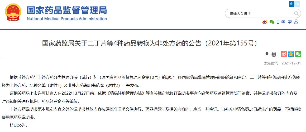 國家藥監(jiān)局關于二丁片等4種藥品轉換為非處方藥的公告(2021年第155號)