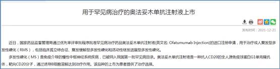 2021年,CDE發(fā)布兩則關(guān)于罕見(jiàn)病用藥的臨床研發(fā)指導(dǎo)原則,通過(guò)優(yōu)先審評(píng)審批方式批準(zhǔn)2款罕見(jiàn)病用藥,分別為奧法妥木單抗注射液(用于治療成人復(fù)發(fā)型多發(fā)性硬化(RMS)) 和注射用司妥昔單抗(用于人體免疫缺陷病毒(HIV)陰性和人皰疹病毒8型(HHV-8)陰性的多中心Castleman?。∕CD)成人患者)。