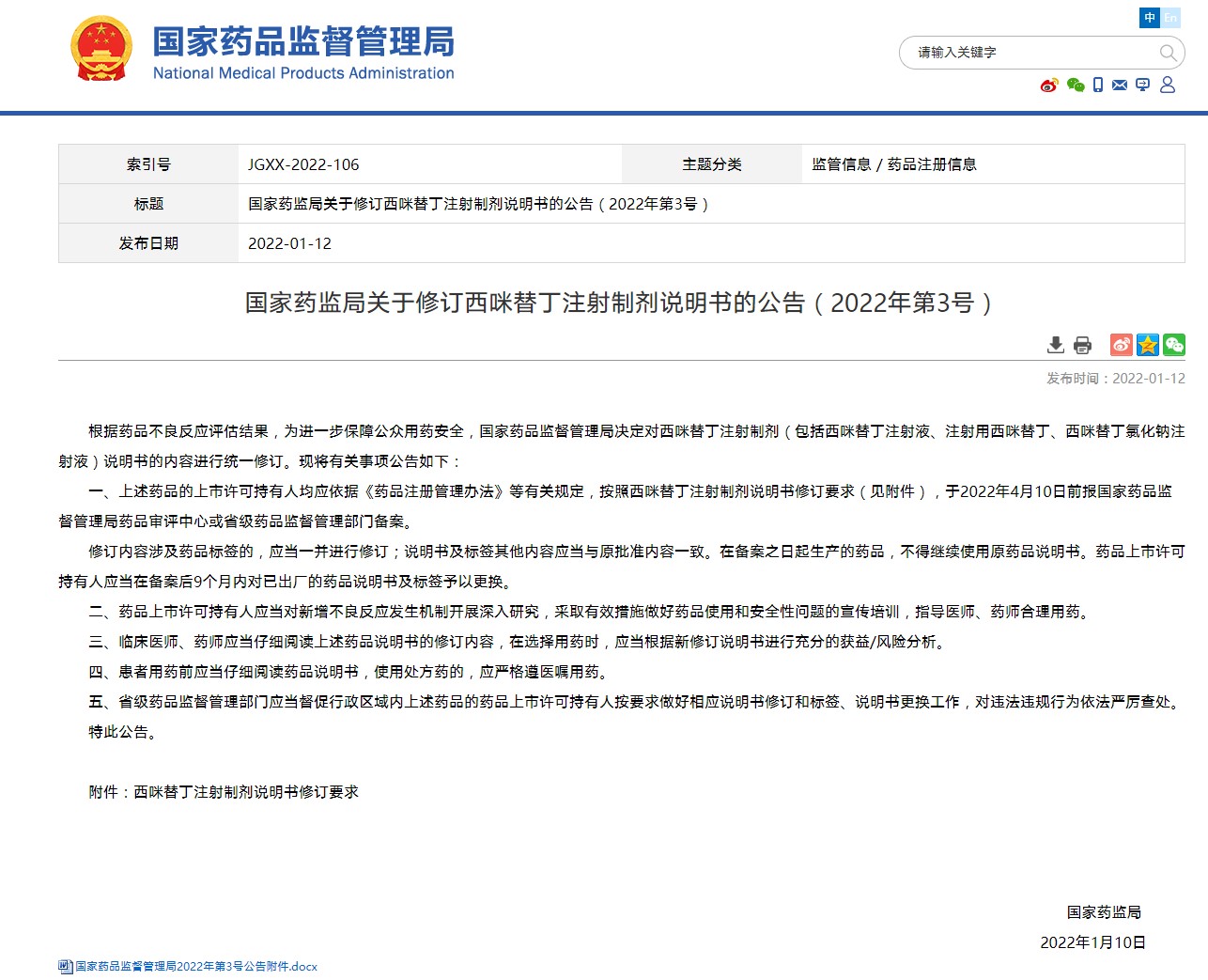國(guó)家藥監(jiān)局關(guān)于修訂西咪替丁注射制劑說明書的公告