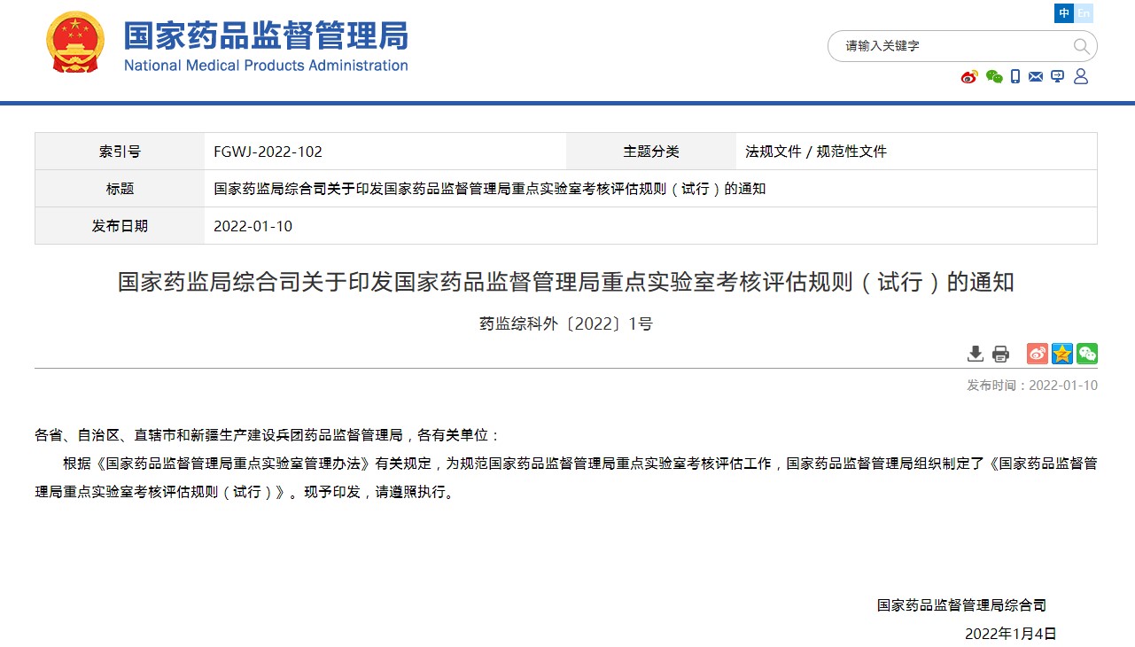 國(guó)家藥監(jiān)局綜合司關(guān)于印發(fā)國(guó)家藥品監(jiān)督管理局重點(diǎn)實(shí)驗(yàn)室考核評(píng)估規(guī)則(試行)