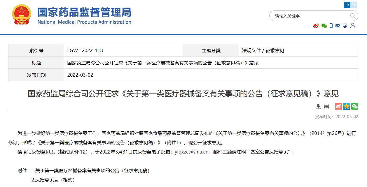 國家藥監(jiān)局綜合司公開征求《關(guān)于第一類醫(yī)療器械備案有關(guān)事項(xiàng)的公告(征求意見稿)》意見