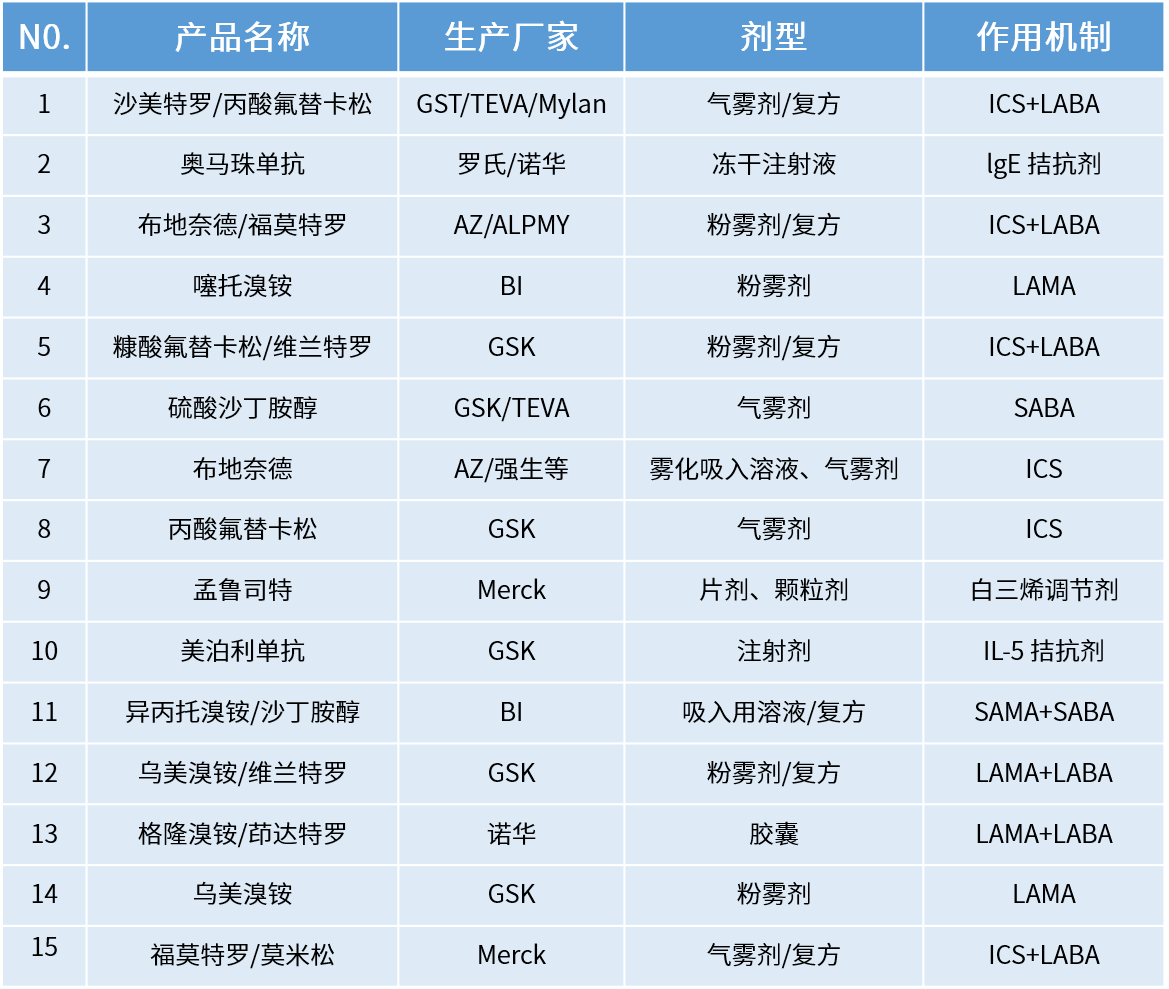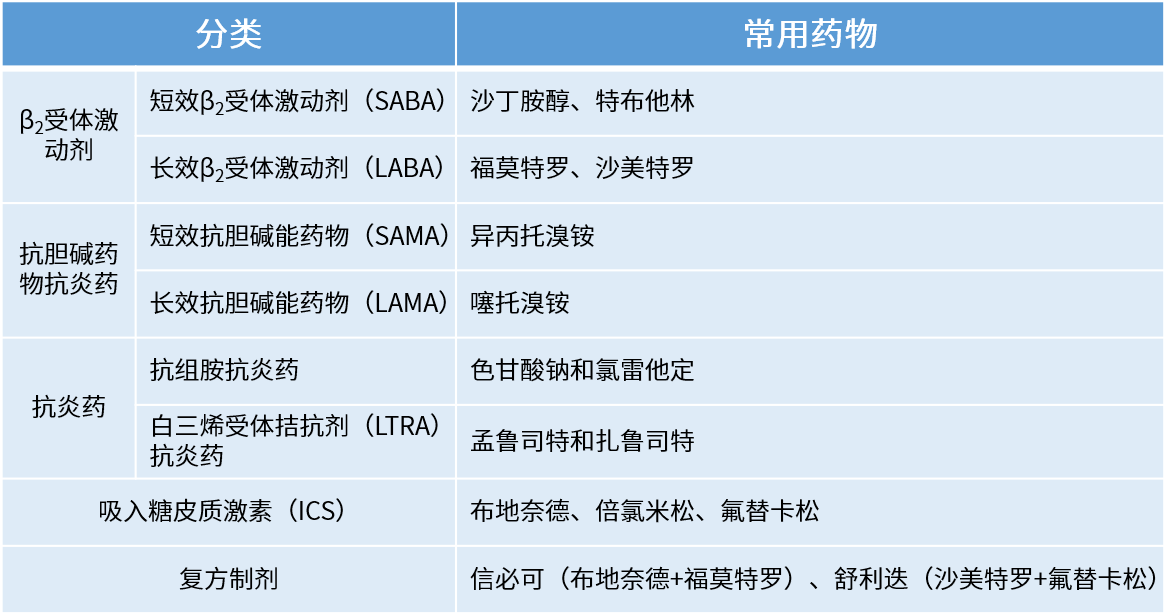 控制類藥物,即需要每天使用并長時間維持應(yīng)用的藥物,包括吸入性糖皮質(zhì)激素(ICS)、ICS/長效β2受體激動劑(ICS/LABA)、全身性激素、白三烯調(diào)節(jié)劑(LTRA)、緩釋茶堿、抗IgE單克隆抗體等;