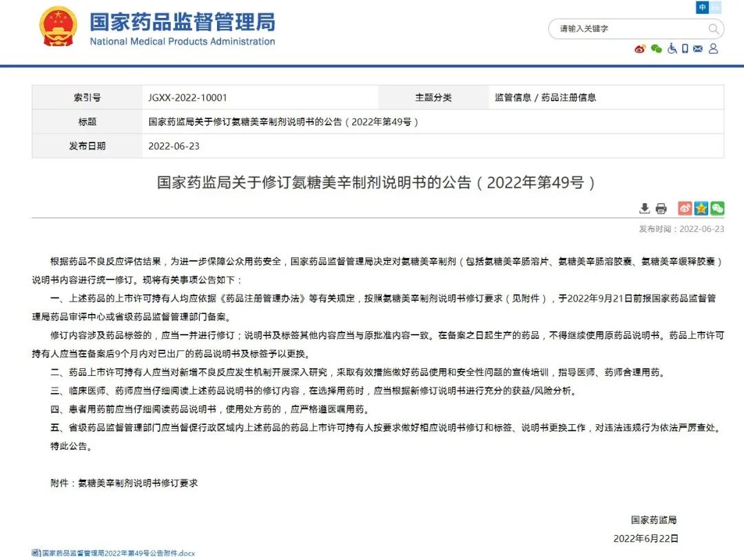 國家藥監(jiān)局關(guān)于修訂氨糖美辛制劑說明書的公告(2022年第49號)