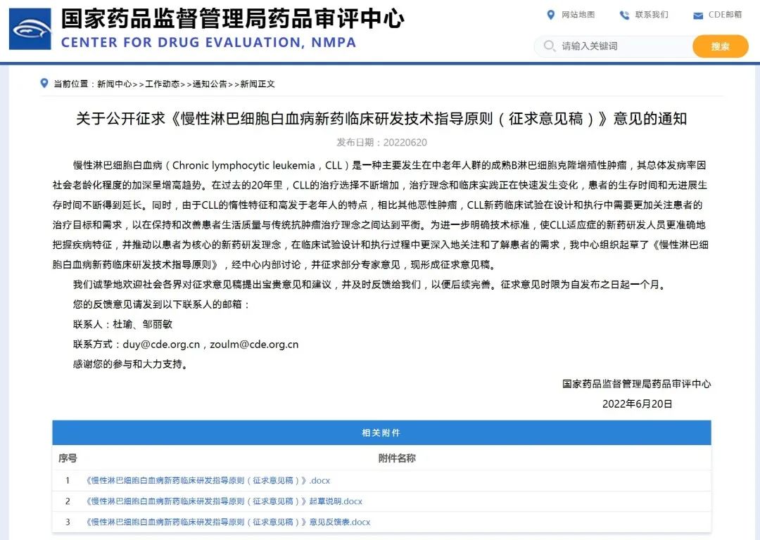 關(guān)于公開征求《慢性淋巴細(xì)胞白血病新藥臨床研發(fā)技術(shù)指導(dǎo)原則(征求意見稿)》意見的通知