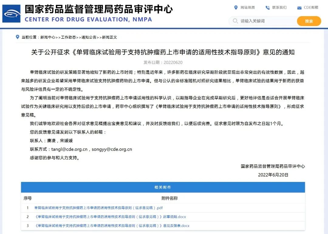 關(guān)于公開征求《單臂臨床試驗用于支持抗腫瘤藥上市申請的適用性技術(shù)指導(dǎo)原則》意見的通知