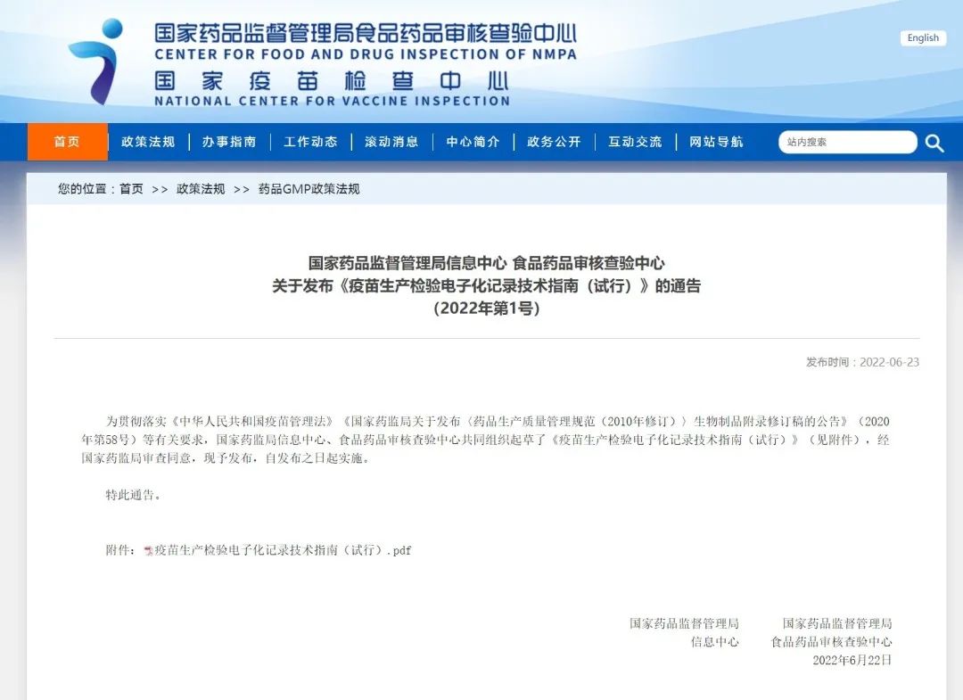 國家藥品監(jiān)督管理局信息中心食品藥品審核查驗中心關(guān)于發(fā)布《疫苗生產(chǎn)檢驗電子化記錄技術(shù)指南(試行)》的通告