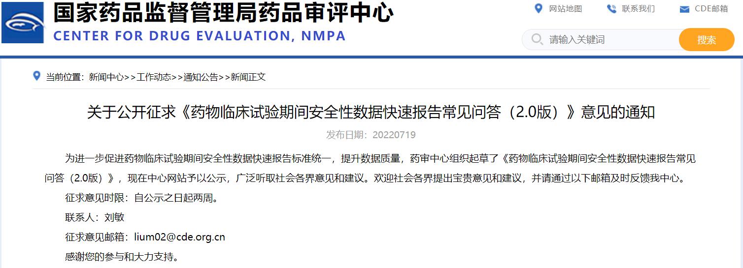 關(guān)于公開征求《藥物臨床試驗(yàn)期間安全性數(shù)據(jù)快速報告常見問答(2.0版)》意見的通知