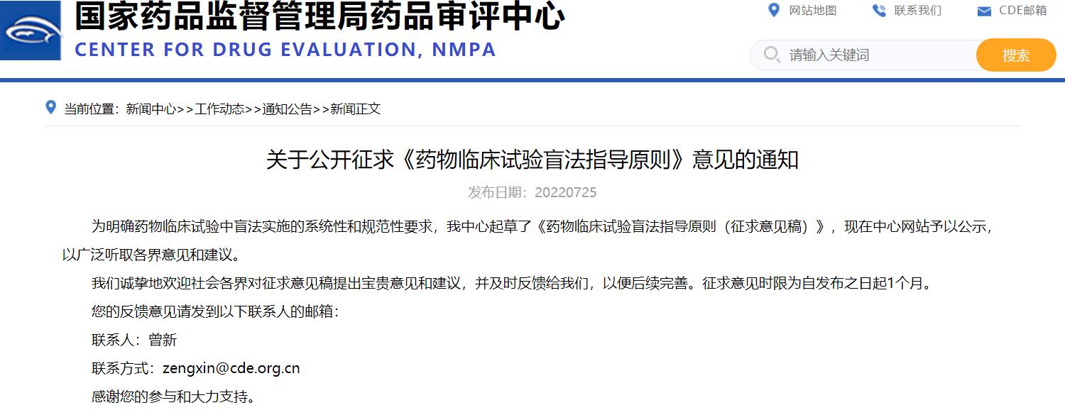 關(guān)于公開(kāi)征求《藥物臨床試驗(yàn)盲法指導(dǎo)原則》意見(jiàn)的通知