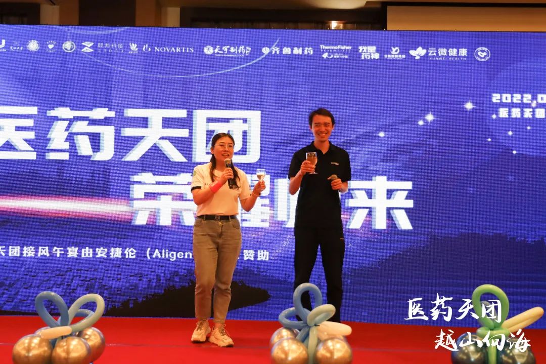 “醫(yī)藥天團”發(fā)起團隊代表、新領先醫(yī)藥總裁高世靜女士(左)和越山向海組委會代表、眾輝智跑商務總監(jiān)尚研先生(右)共同舉杯