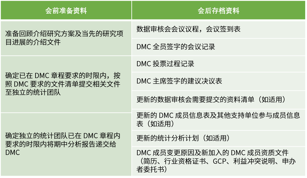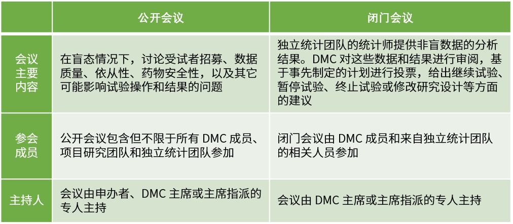 DMC啟動會應在首例受試者入組前召開,參會人員包含但不限于所有DMC成員、項目研究團隊和獨立統(tǒng)計團隊。