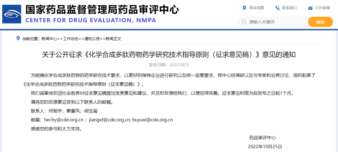 關(guān)于公開征求《化學(xué)合成多肽藥物藥學(xué)研究技術(shù)指導(dǎo)原則(征求意見稿)》意見的通知