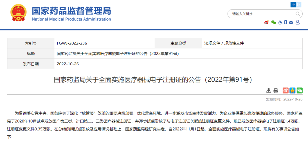 國家藥監(jiān)局關(guān)于全面實(shí)施醫(yī)療器械電子注冊(cè)證的公告(2022年第91號(hào))
