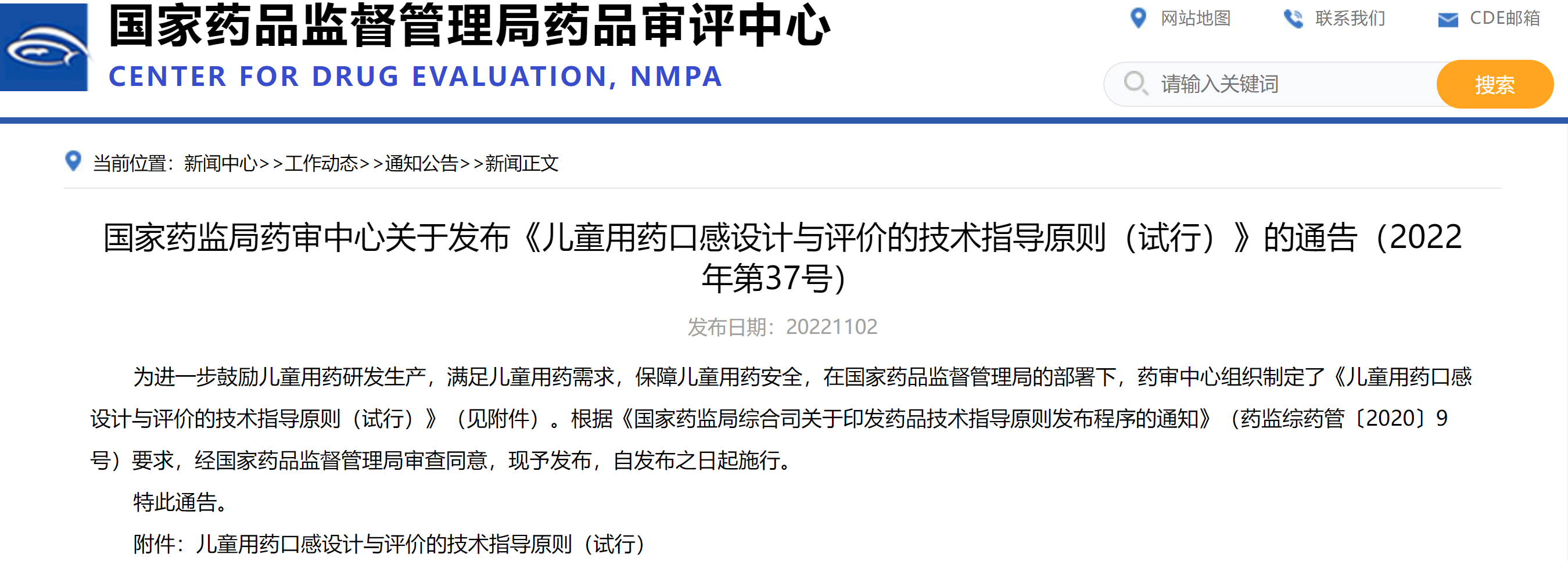 國家藥監(jiān)局藥審中心關(guān)于發(fā)布《兒童用藥口感設(shè)計與評價的技術(shù)指導(dǎo)原則(試行)》的通告(2022年第37號)