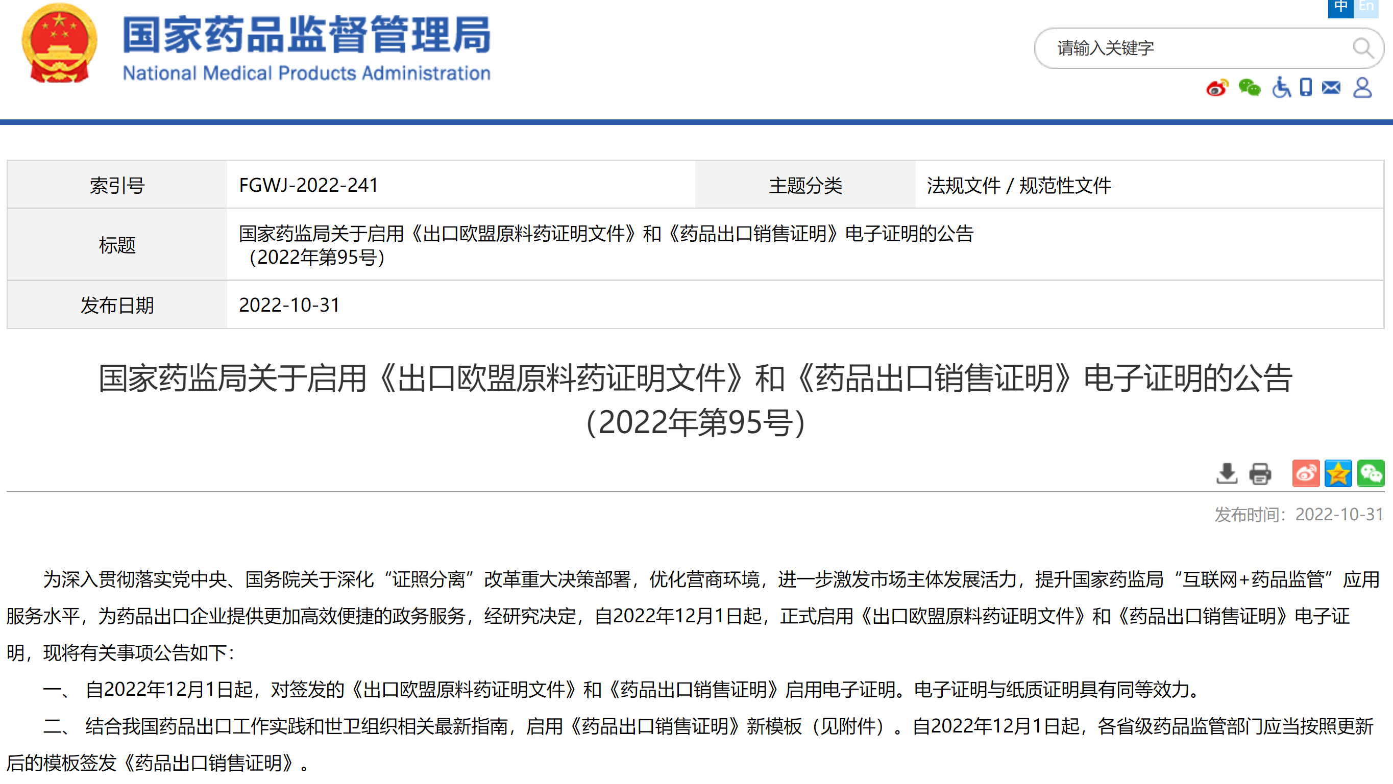 國家藥監(jiān)局關(guān)于啟用《出口歐盟原料藥證明文件》和《藥品出口銷售證明》電子證明的公告(2022年第95號)