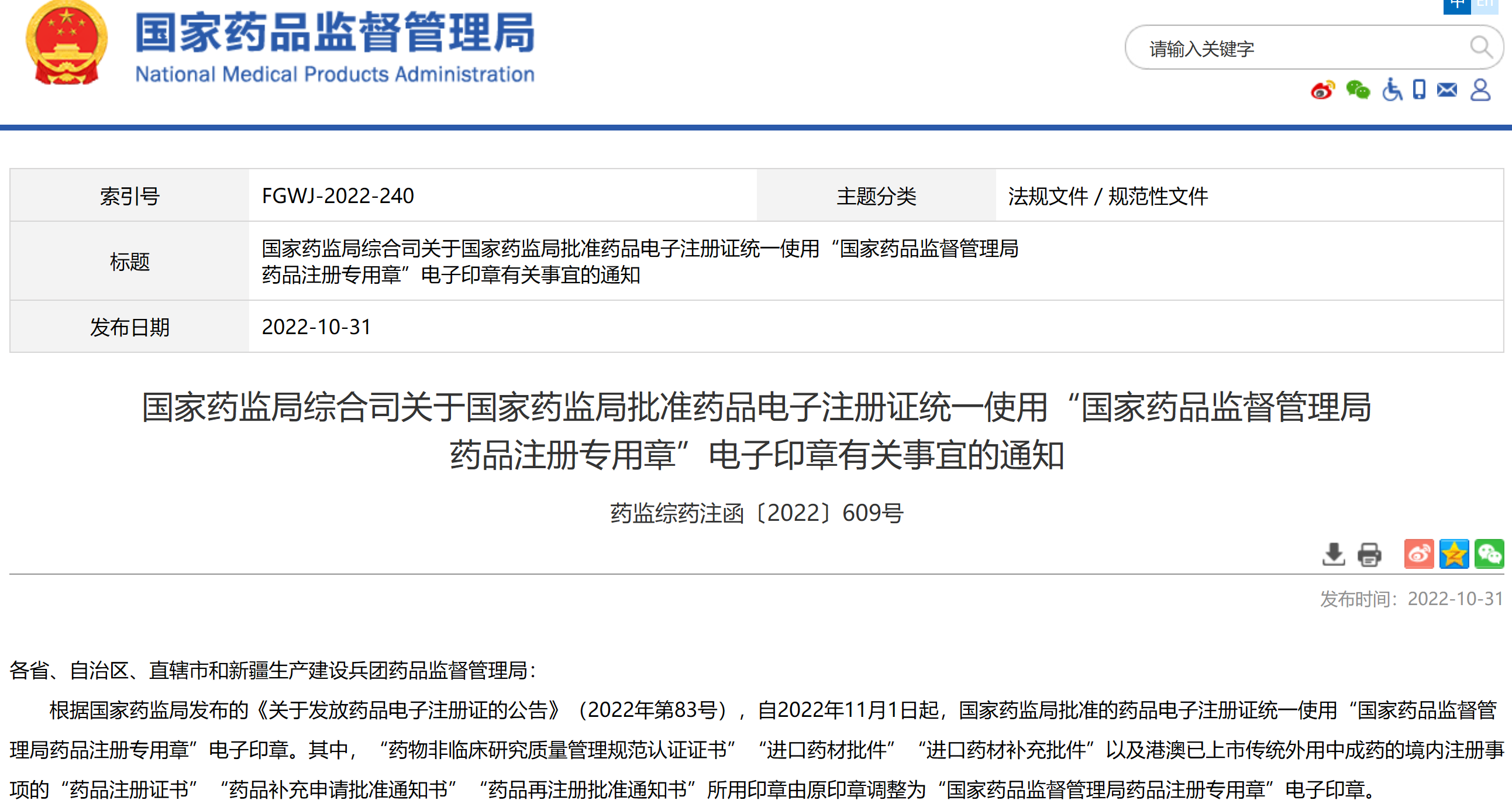 國家藥監(jiān)局綜合司關(guān)于國家藥監(jiān)局批準(zhǔn)藥品電子注冊證統(tǒng)一使用“國家藥品監(jiān)督管理局藥品注冊專用章”電子印章有關(guān)事宜的通知
