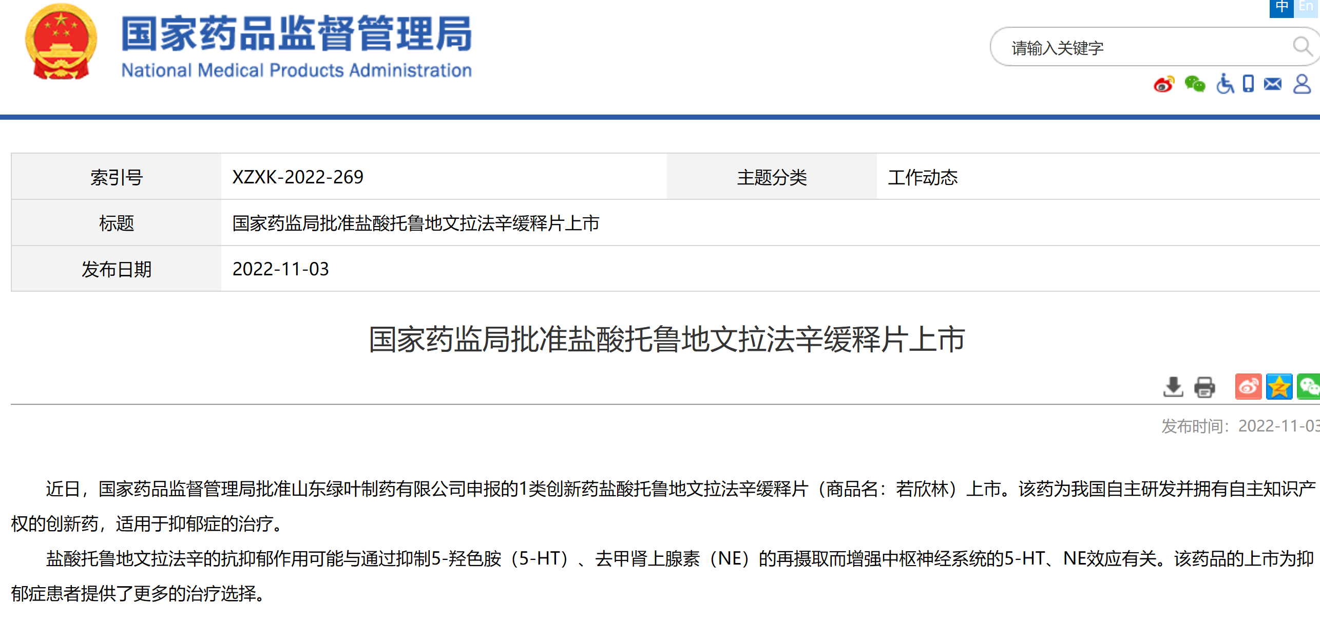 國家藥監(jiān)局批準(zhǔn)鹽酸托魯?shù)匚睦ㄐ辆忈屍鲜?/span>