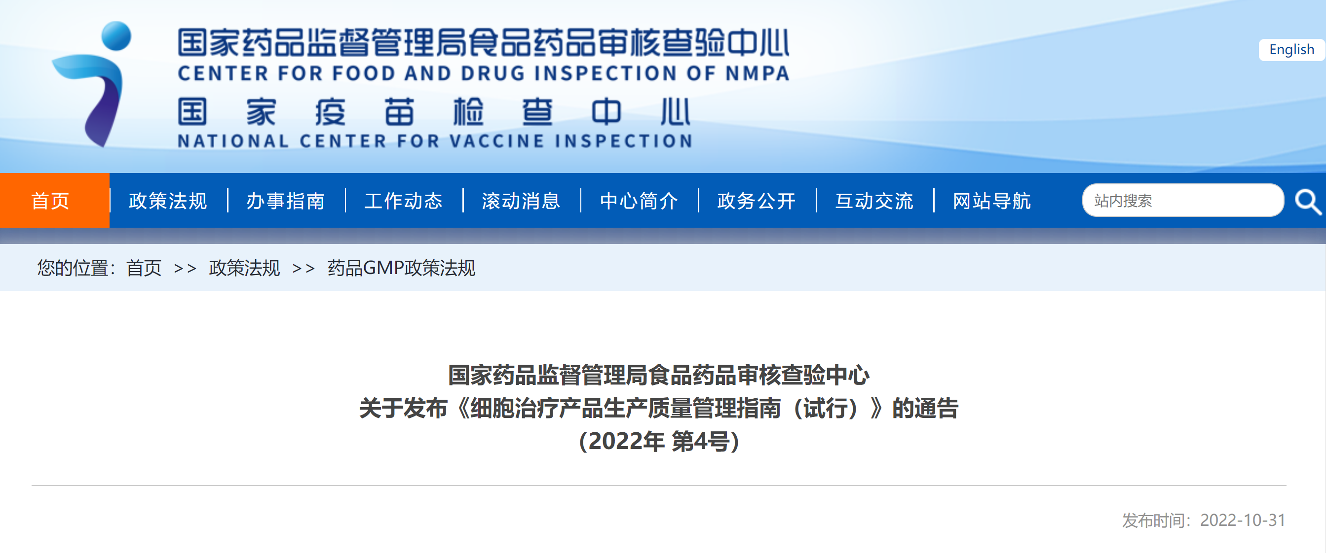 國家藥品監(jiān)督管理局食品藥品審核查驗中心關(guān)于發(fā)布《細胞治療產(chǎn)品生產(chǎn)質(zhì)量管理指南(試行)》的通告(2022年第4號)
