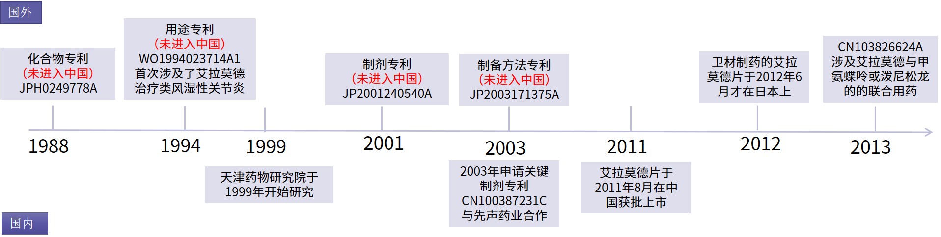 艾拉莫德(Iguratimod)臨床上用于治療類風濕性關節(jié)炎。艾拉莫德化合物由日本富山化學于1988年申請了化合物專利JPH0249778A,后富山化學與衛(wèi)材藥業(yè)進行合作開發(fā),明確了研發(fā)艾拉莫德的主要應用方向為類風濕性關節(jié)炎并進行了臨床研究,于1994年申請的專利WO1994023714A1首次涉及了艾拉莫德治療類風濕性關節(jié)炎,該專利在日本、歐洲、美國等國家或地區(qū)獲得授權,但是卻沒有進入中國。但艾拉莫德關鍵的化合物專利(JPH0249778A)及用途專利(WO1994023714A1)未進入中國的專利布局失誤,為后來先聲藥業(yè)的艾拉莫德片率先上市而衛(wèi)材失去中國市場埋下了伏筆。隨著臨床的進展,富山化學在2001-2003年又申請了涉及艾拉莫德片的制劑專利JP2001240540A及艾拉莫德制備方法的制備方法專利JP2003171375A,該2件專利同樣也未進入中國。