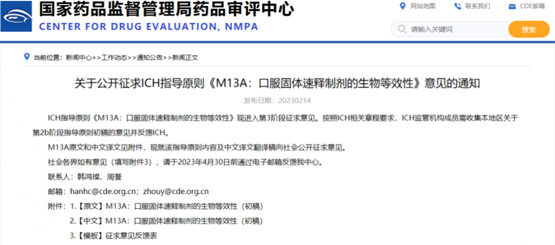 關于公開征求ICH指導原則《M13A:口服固體速釋制劑的生物等效性》意見的通知