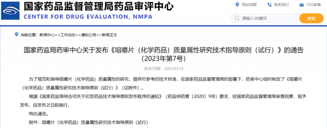 國家藥監(jiān)局藥審中心關于發(fā)布《咀嚼片(化學藥品)質(zhì)量屬性研究技術(shù)指導原則(試行)》的通告(2023年第7號)