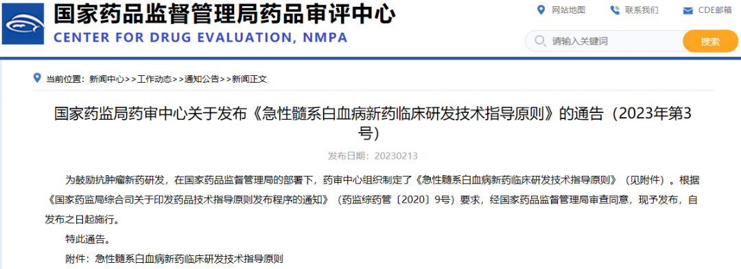 國家藥監(jiān)局藥審中心關于發(fā)布《急性髓系白血病新藥臨床研發(fā)技術(shù)指導原則》的通告(2023年第3號)